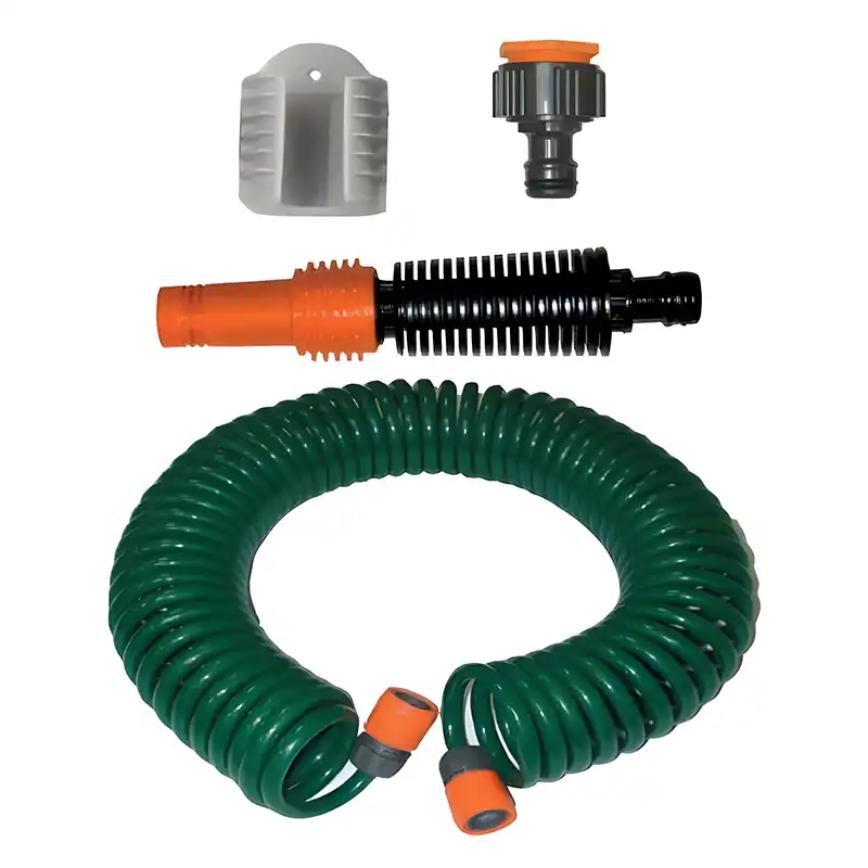 צינור קפיצי קוטר “3/8 בבליסטר, סט חיבורים מהירים ומתז ידני, כולל מתלה לקיר | אלגו השקיה צינור קפיצי עם אביזרים 7.5 מ’ קוטר 3/8″